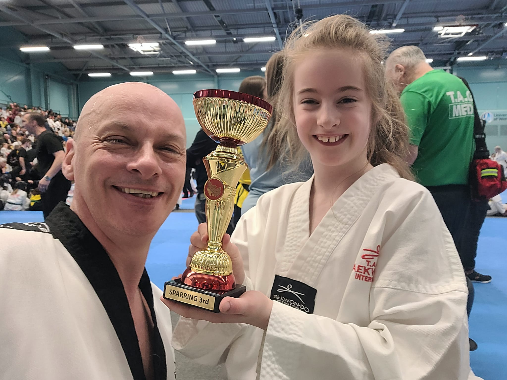 Our eight year old daughter also trains with us, and is a member of the same club I train at in Malmesbury. I have been encouraging her to compete at the local and national tournaments. To support her with this, I’ve started competing myself again, which I hadn’t done since 2004 when I was a first Degree Black Belt. She has gone on to win some medals which has made me very proud! We are due to compete in the Welsh Championships in May 2022.